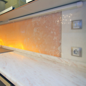 Как вариант, отделка фартука ониксом. Камень имеет свойство пропускать свет и с дополнительной подсветкой такой фартук будет смотреться очень изысканно.